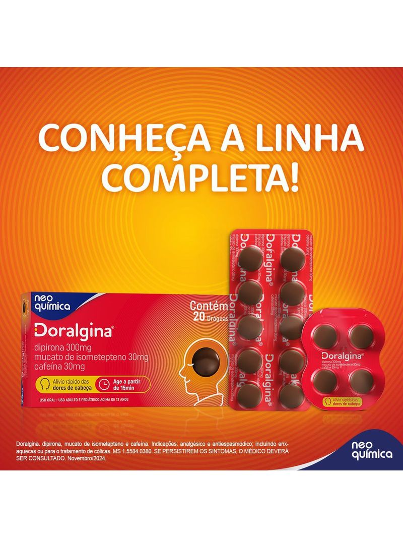 Indicação:A Doralgina é um medicamento com atividade analgésica (diminui a dor) e antiespasmódica (diminui contração involuntária) indicado para o tratamento de diversos tipos de dor de cabeça, incluindo enxaquecas ou para o tratamento de cólicas.