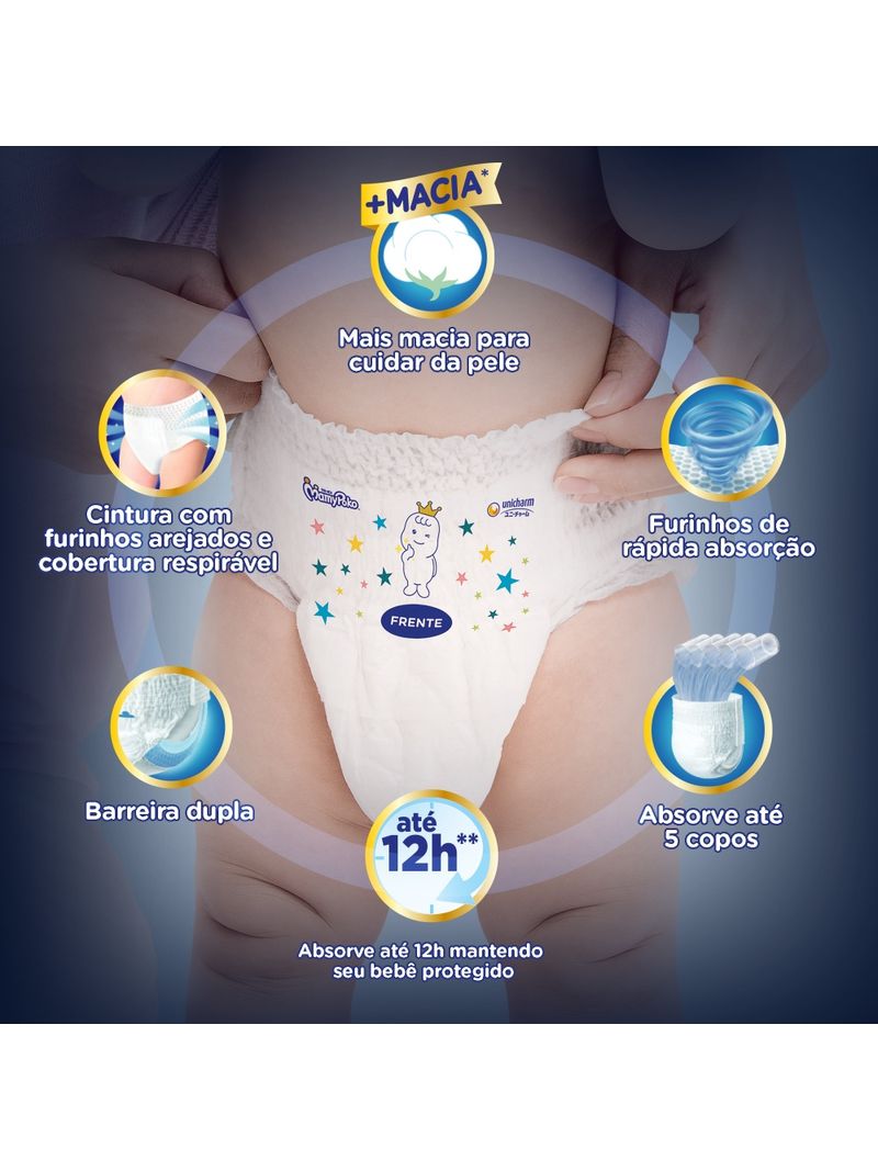 AlĂ©m disso, absorve atĂ© 5 copos de lĂ­quido, tem Caminhos de ArÂź que fazem o ar circular melhor dentro da fralda, e Microporos que liberam a umidade de dentro para fora mantendo o bebĂȘ sempre sequinho e confortĂĄvel.