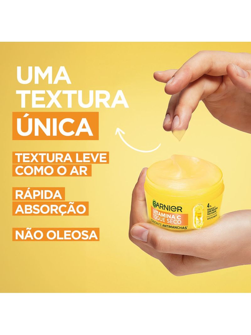 Garnier Hidratante Vitamina C Toque Seco é um hidratante facial numa textura revolucionária para peles mistas e oleosas. Hidrata e reduz a oleosidade com 8h de toque seco. com vitamina C, ácido hialurônico e niacinamida, o novo Hidratante Toque Seco Antimanchas uniformiza a pele, reduz -34% as manchas da pele, controla a oleosidade, além de hidratar sem pesar. Com resultados comprovados pelas consumidoras, onde 81% sentiram redução de manchas, 91% sentiram a pele não oleosa e 90% disse ser a melhor textura hidratante que já experimentou, o Hidratante Toque Seco Antimanchas possui uma textura que não é gel, não é creme, não pesa, só experimentando para sentir! Pode ser usado diariamente na sua rotina de skincare e em todos os tipos de pele, em especial as peles mistas e oleosas.
