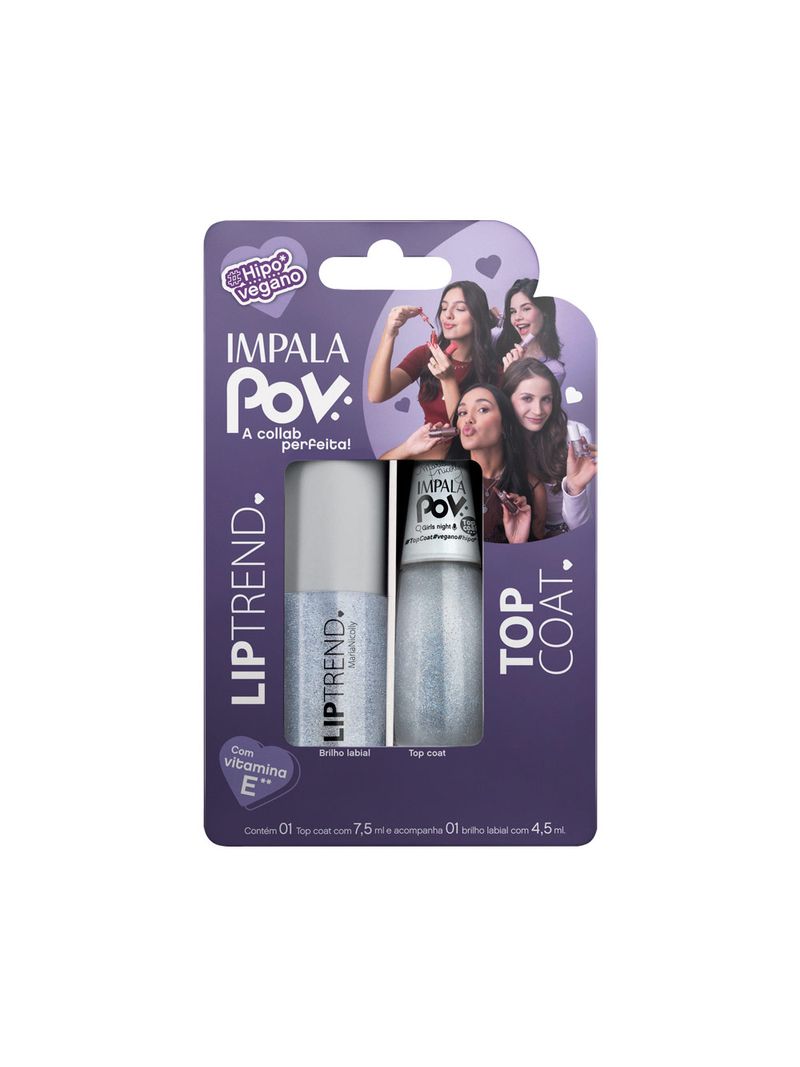 Tudo o que você precisa para destacar seu brilho e deixar sua esmaltação impecável. Este kit vem com 1 gloss labial Lip Trend, com textura leve, brilho translúcido e Vitamina E para hidratar e realçar seus lábios, e 1 esmalte Top Coat Impala POV, que garante acabamento extra brilho e prolonga a durabilidade das unhas. Fórmulas hipoalergênicas, dermatologicamente testadas e não testada em animais, pensadas pra acompanhar o seu estilo com segurança e performance.