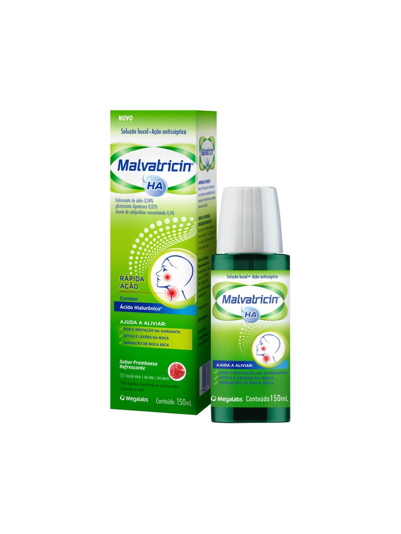 Malvatricin HA Framboesa 150ml Refresca, protege e cuida da sua boca! Malvatricin HA é uma solução antisséptica bucal pronta para uso, ideal para o cuidado diário da saúde bucal. Com sabor refrescante de menta, ajuda a combater bactérias, aliviar aftas e irritações na garganta, além de proporcionar sensação de limpeza e frescor. Indicação: Alívio de dor de garganta Aftas e afecções da boca Higiene bucal complementar Composição: Tirotricina 0,10 mg/mL Sulfato de hidroxiquinolina 1,00 mg/mL Essência de menta, tintura de Malva sylvestris, mentol e outros excipientes Modo de uso: Bochechar ou gargarejar 3 a 4 vezes ao dia, sem diluir Evite comer ou beber por 30 minutos após o uso Uso adulto e pediátrico | Sem prescrição médica | Via tópica oral Importante: Não ingerir Contraindicado para menores de 2 anos Não utilizar durante a gravidez sem orientação médica Registro ANVISA: 80219199002 Produto válido e regularizado