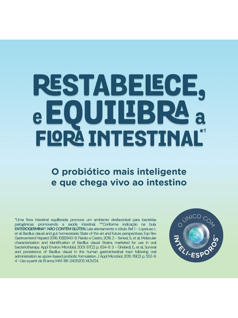 Os esporos do probiótico Bacillus clausii contidos em Enterogermina Adulto são resistentes ao ácido gástrico, portanto chegam intactos até o trato digestivo, no qual se espalham, promovendo o equilíbrio e restaurando a microbiota intestinal³.