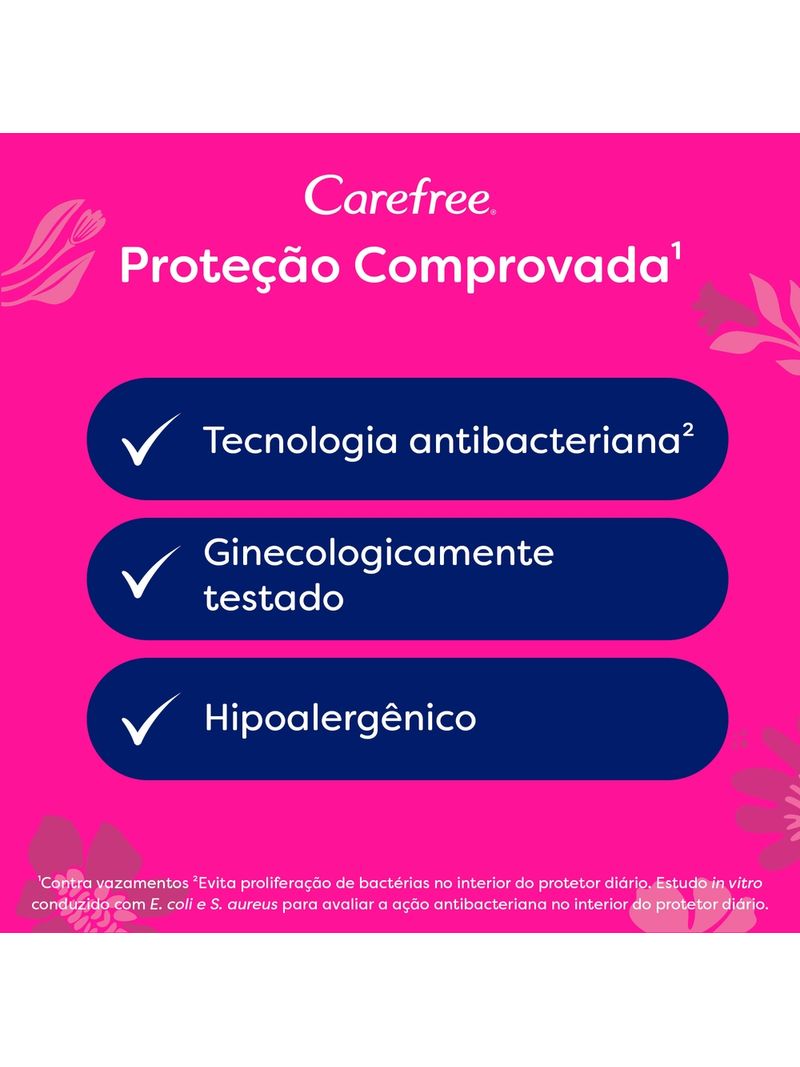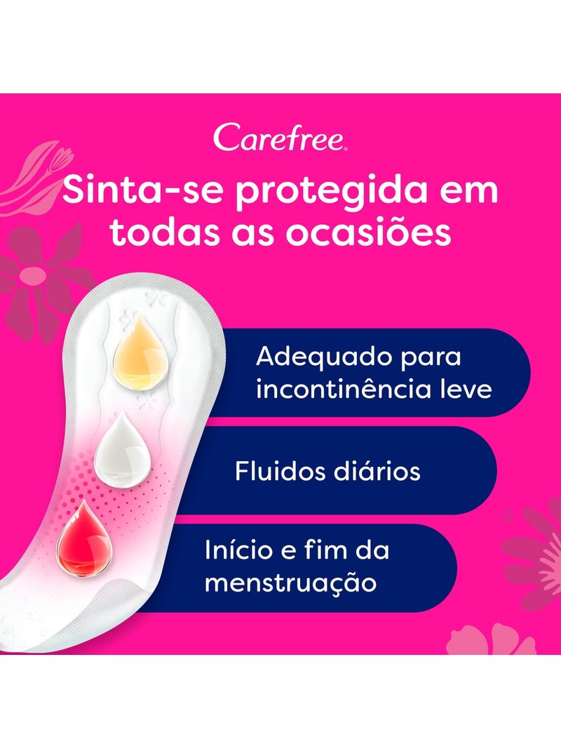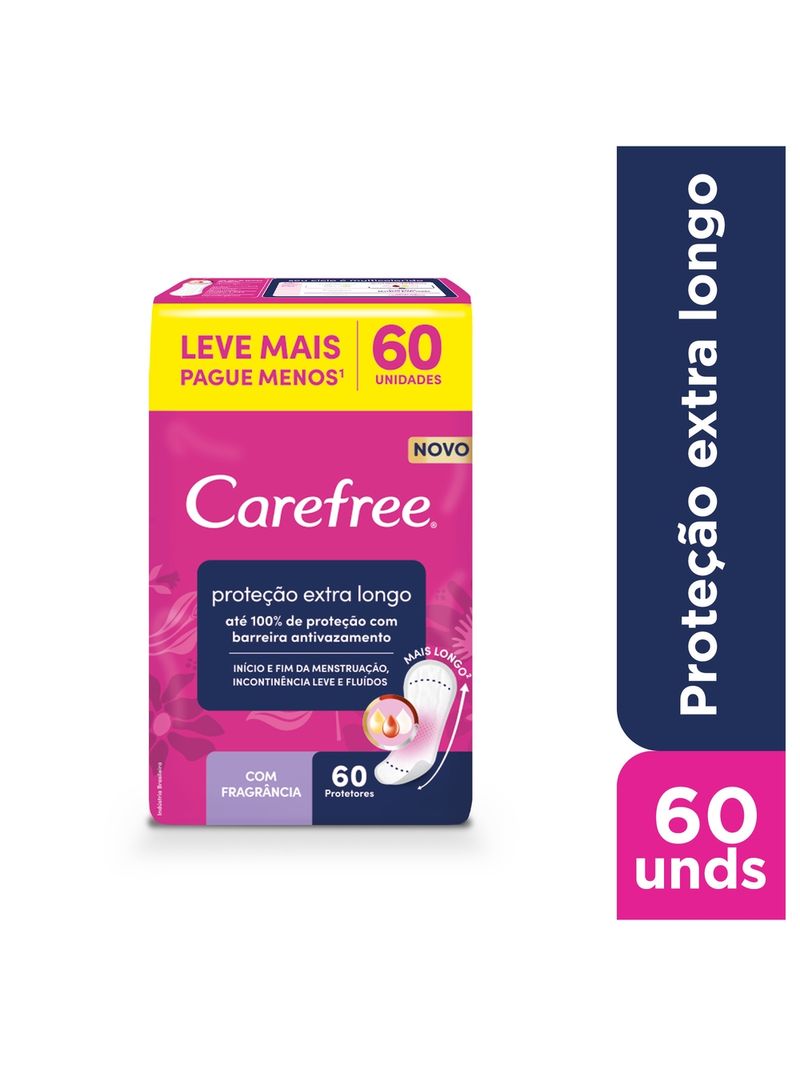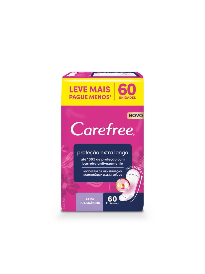 CAREFREE Proteção Extra Longo é ideal para início e fim de menstruação, incontinência leve e fluxos do dia a dia. Com sua barreira antivazamento, ele oferece até 100% de proteção e controle de odores, mantendo a área íntima seca. Com design mais longo, 32mm maior que Carefree Proteção, ele garante mais segurança e absorção.