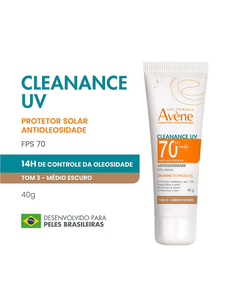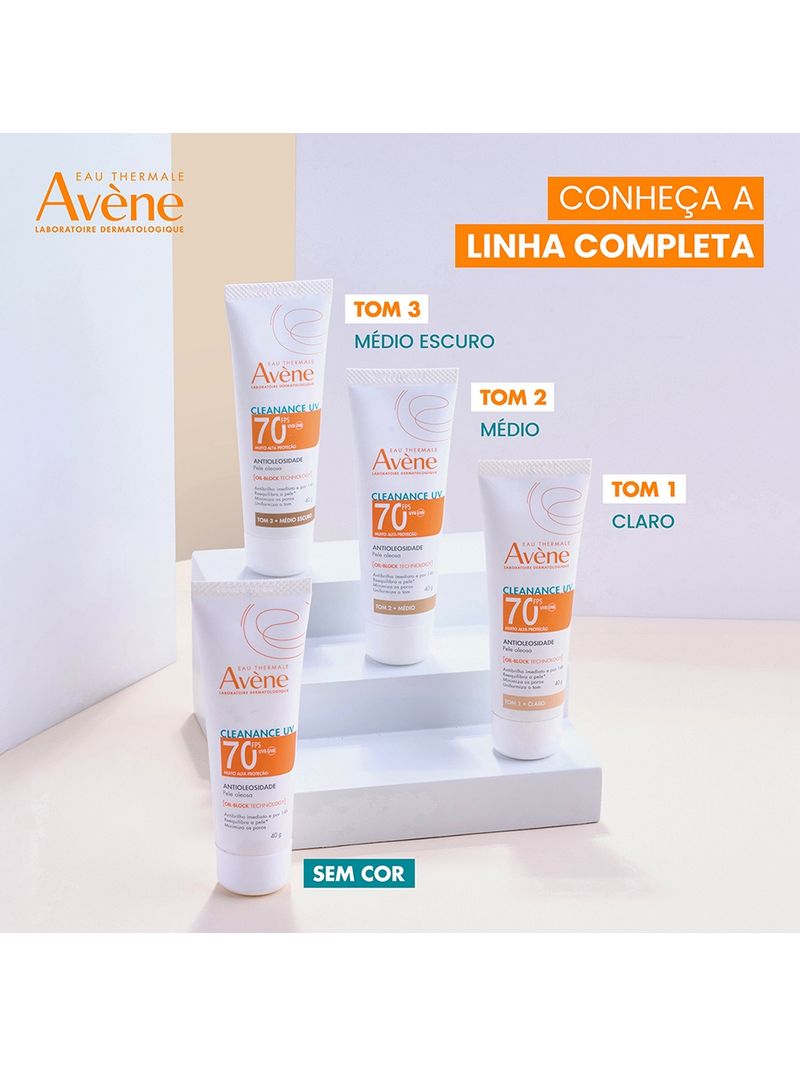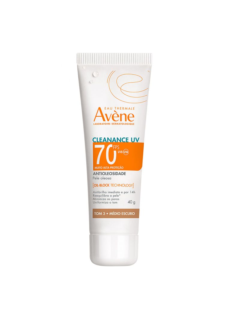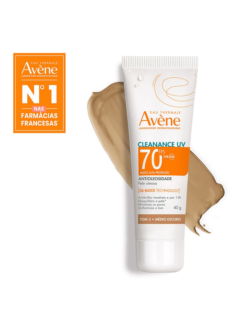 Avène Cleanance Protetor Solar Facial UV Antioleosidade FPS 70 Tom 3 Médio Escuro 40g é o primeiro protetor solar da linha com tecnologia oil-block que garante o controle de oleosidade e brilho por até 14 horas. Sua fórmula avançada oferece muito alta proteção solar FPS 70 e um toque de cor que se adapta perfeitamente a peles de tom médio escuro.