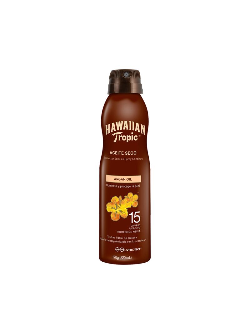 O Protetor Solar em Spray Hawaiian Tropic Aceite Seco FPS15 possui uma proteção eficaz. Sua fórmula é incolor, tem textura leve e contém Óleo de Argan, Vitamina C e E, para um efeito regenerador na pele, estimulando a elasticidade e oxigenação. Além disso, não impede de ter um bronzeado maravilhoso com hidratação e segurança.