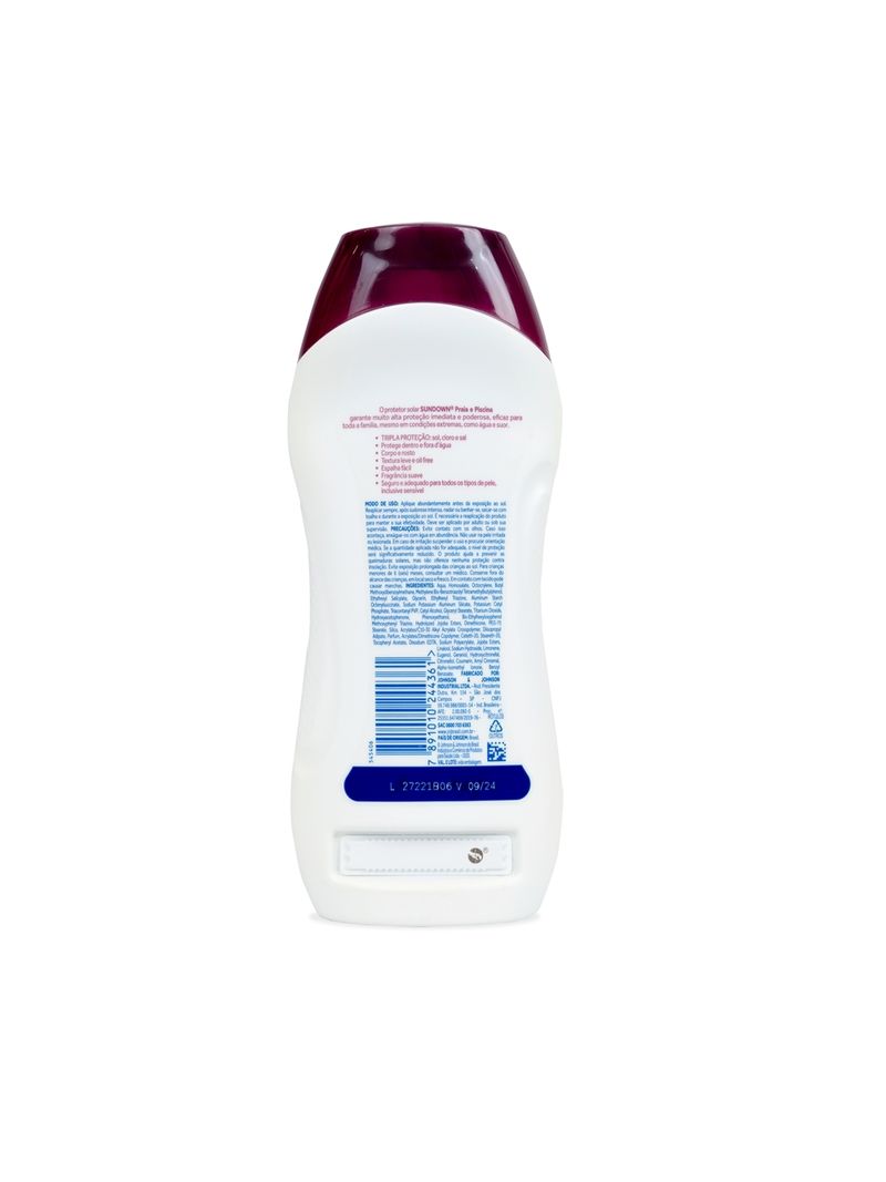 O Protetor solar Sundown Praia e Piscina FPS 70; com tripla proteção, ajuda a proteger a pele de elementos agressores como o sol, cloro e a Ć”gua salgada do mar. Oferece proteção imediata uva + uvb, protegendo a pele de queimaduras solares dentro e fora d'Ć”gua. Ć resistente Ć Ć”gua e ao suor e seguro para uso em toda famĆlia. Proteção completa para curtir a vida ao ar livre; uva + uvb balanceado