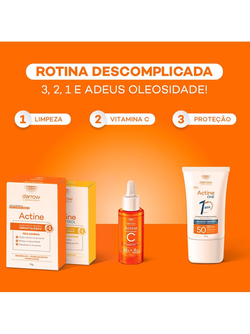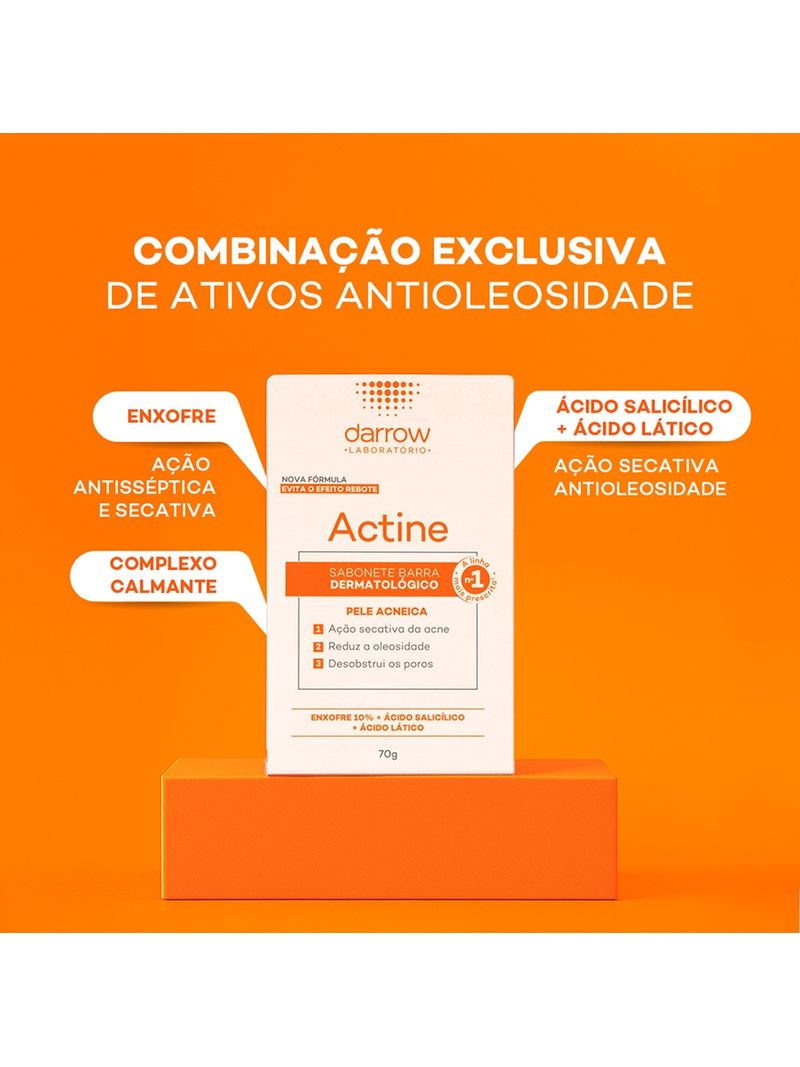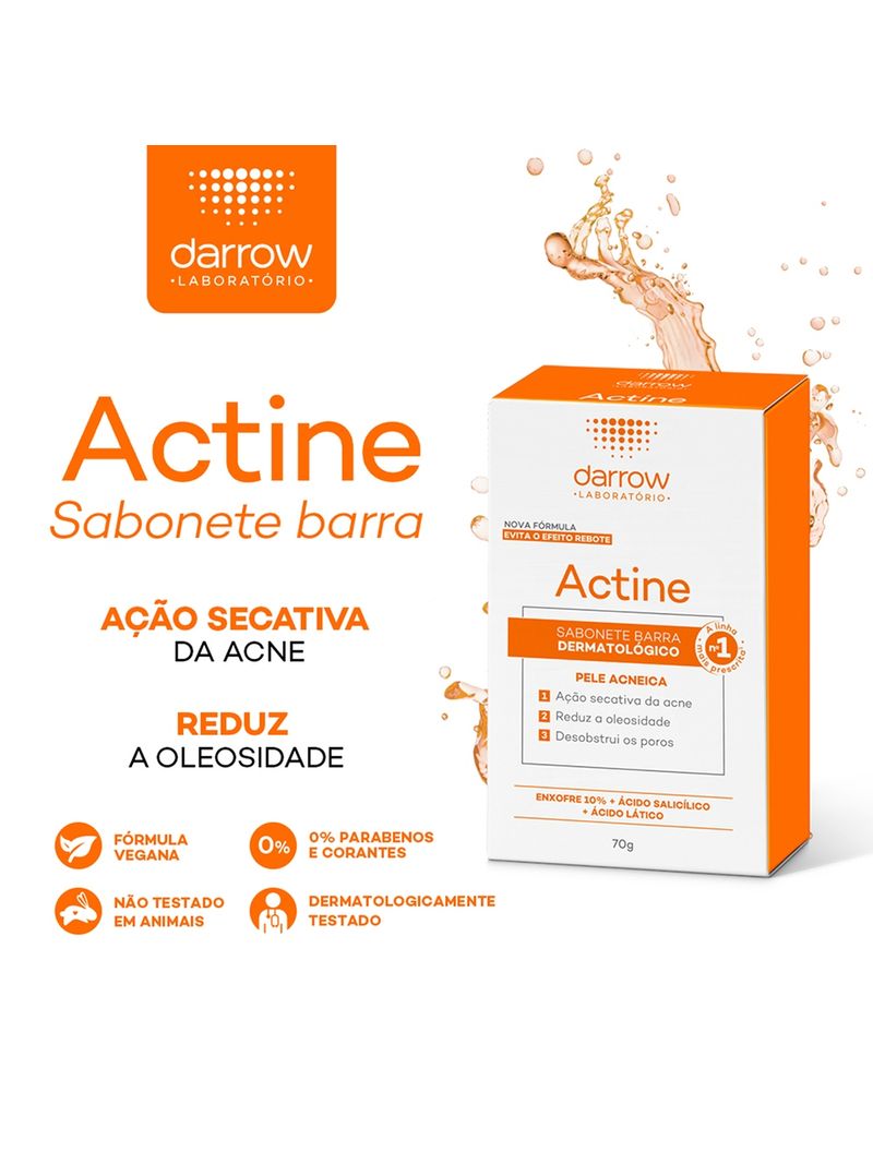 Para potencializar os resultados, utilize o Darrow Actine Sabonete Barra em sua rotina de limpeza matinal e noturna. Complete o cuidado com um hidratante facial oil-free e um protetor solar, ambos da linha Actine, para garantir uma pele saudável.