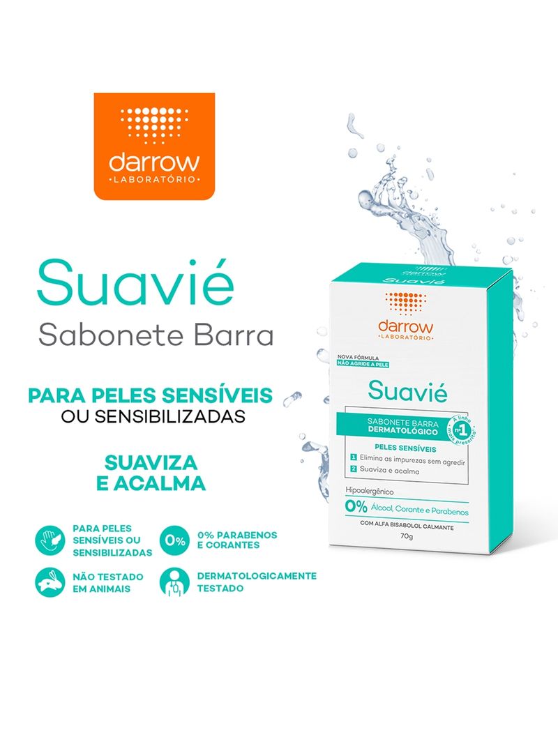 Darrow Suavié Sabonete em Barra 70g é a solução ideal para a limpeza diária de peles sensíveis e delicadas. Sua fórmula foi cuidadosamente elaborada para higienizar de forma suave e eficaz, sem comprometer a barreira cutânea da pele.
