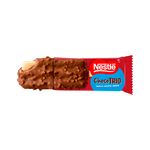 Sorvete de chocolate com recheio de chocolate branco e coberto com pedaços de chocolate.