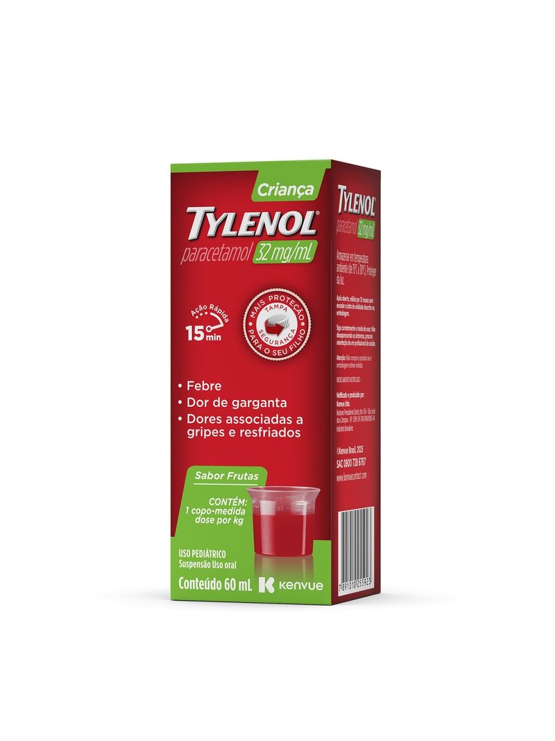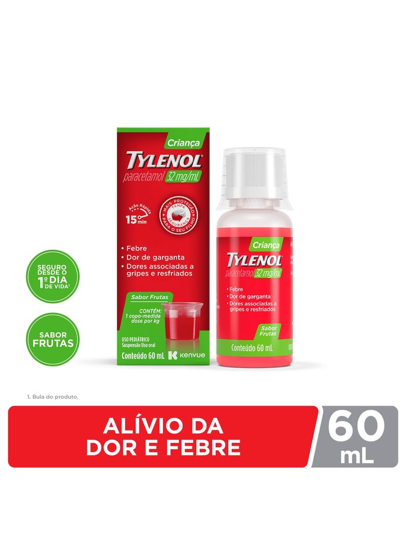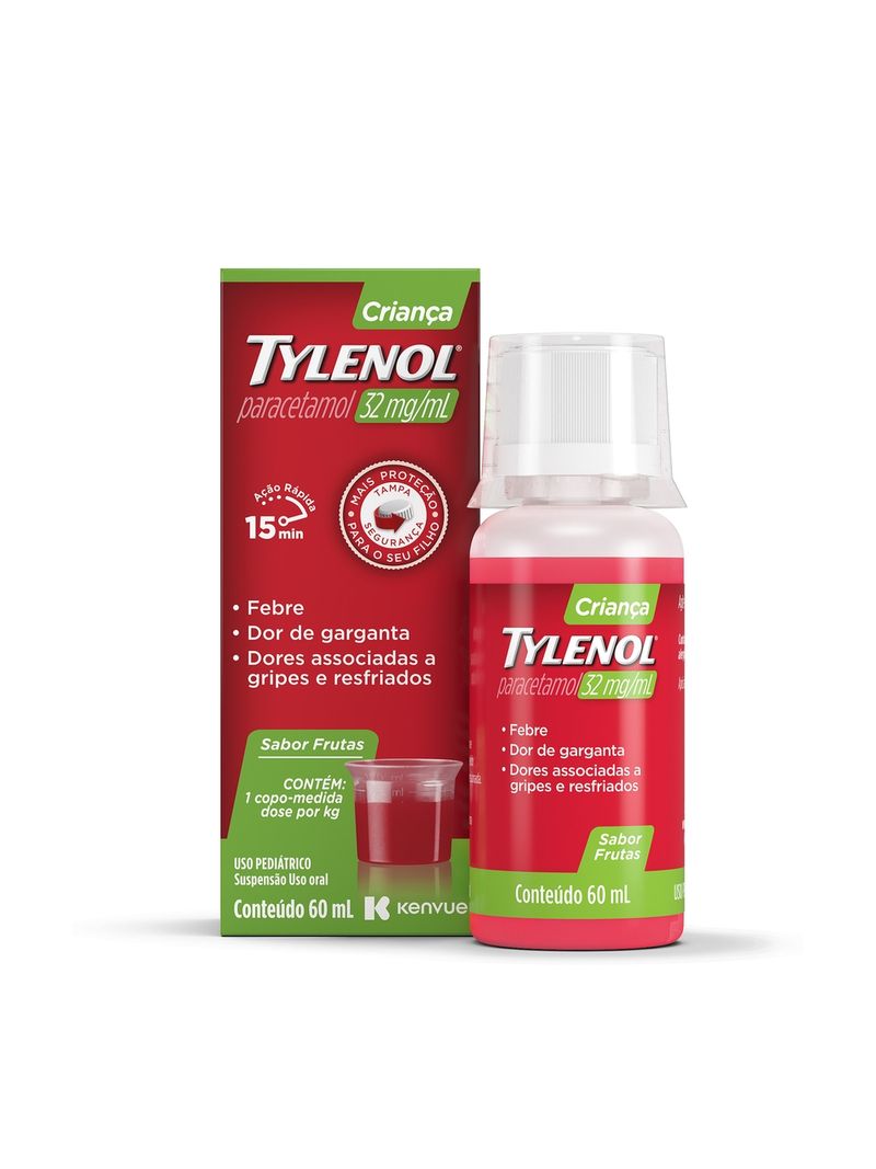 O Tylenol Criança é um analgésico e antitérmico em suspensão oral 60ml com o princípio ativo paracetamol 32mg/ml indicado para crianças acima de três anos de idade para a redução da febre e para o alívio temporário de dores leves a moderadas, como aquelas associadas a gripes e resfriados comuns, dor de cabeça, dor de dente e dor de garganta. Sabor Frutas. Com copo dosador. Uso pediátrico. *Publicado por Nicholas Hall Report, agosto de 2020