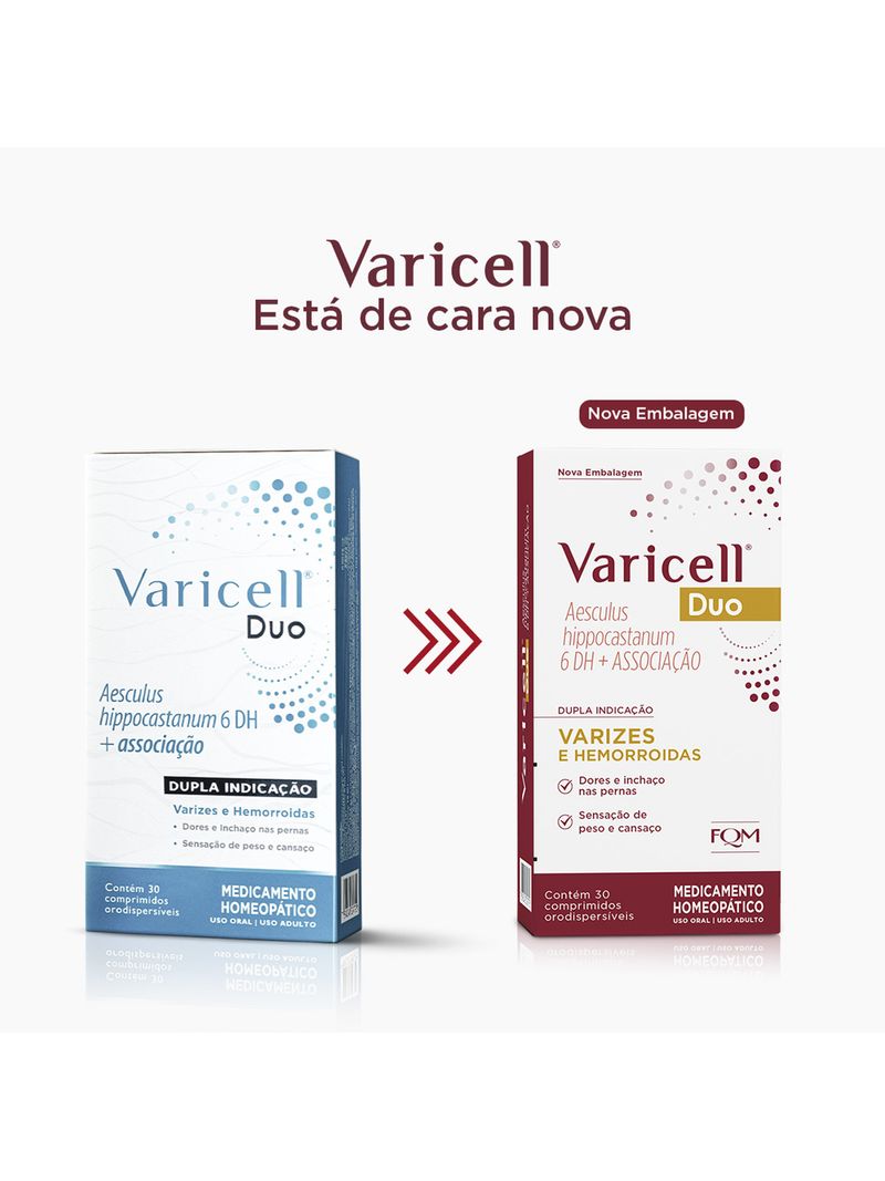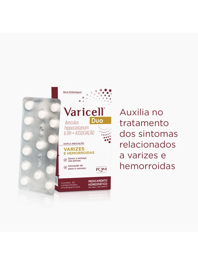 Indicação: VARICELL® DUO é indicado como auxiliar no tratamento dos sintomas relacionados a varizes e hemorroidas (como sensação de dor, peso, congestão, plenitude, prurido e sensíveis ao toque dos pés, pernas e hemorroidas).